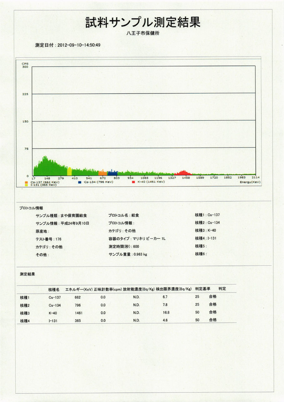 八王子市からの、第一回給食の放射線測定に関する調査について、「合格」をいただきました!
